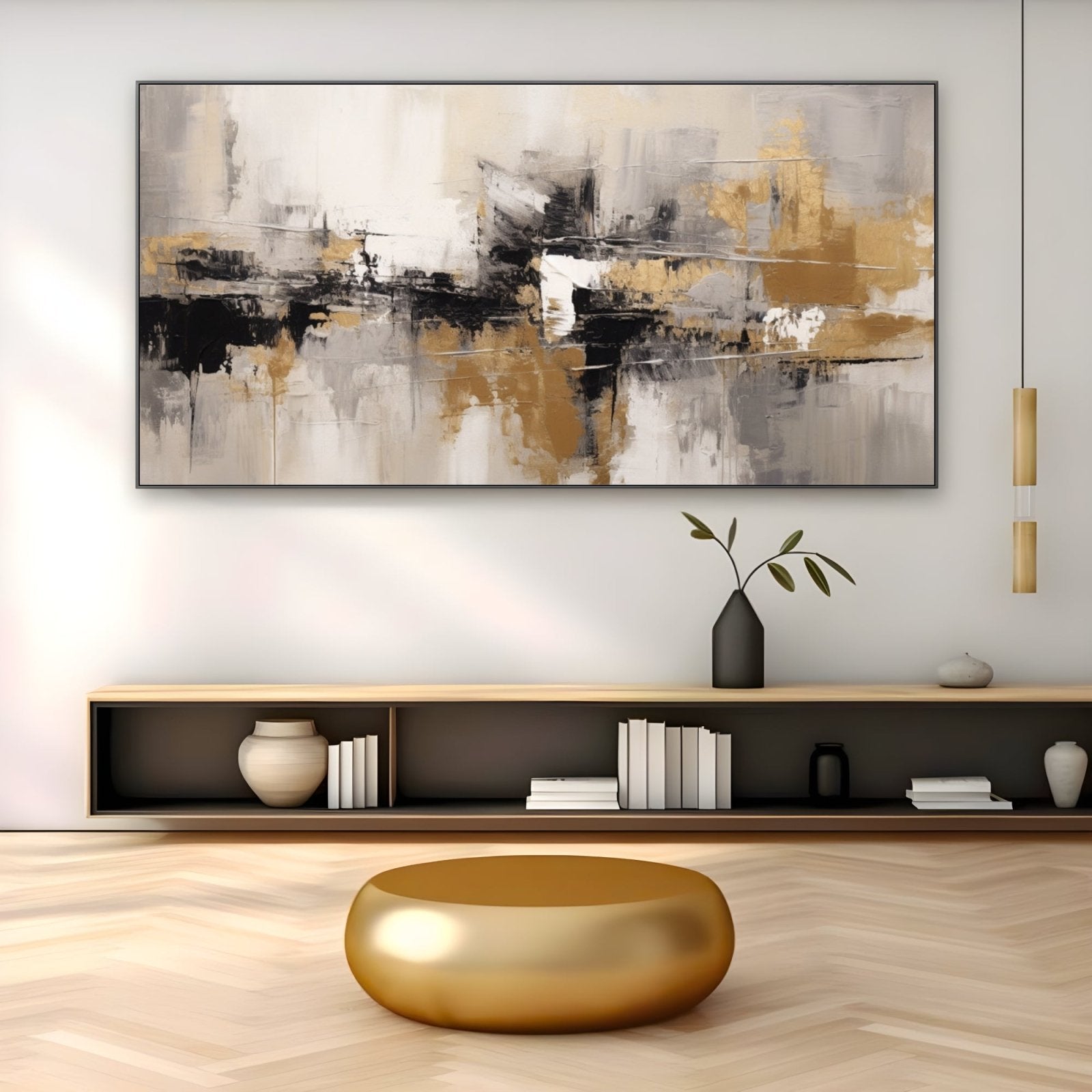 Deep blacks, pure whites, and smoky grays blend seamlessly with golden and beige accents. This mix of neutral and metallic tones creates a captivating visual effect, adding movement and depth to the composition.